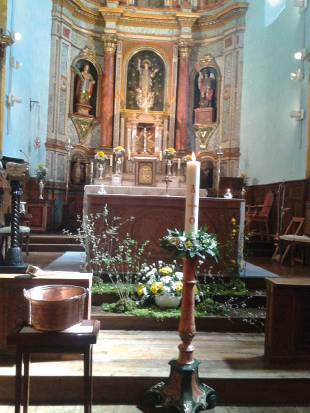 Aste Santua ospatzeko hainbat aukeren artean daude elizkizunak. Larunbat Santua egun garrantzitsua da fededunen artean. Ura eta argia bedeinkatu berria tartean, argazkian azaltzen den bezalaxe, aldarea ere oso polit apainduta agertu zen, festa ederrena ospatzeko prest.