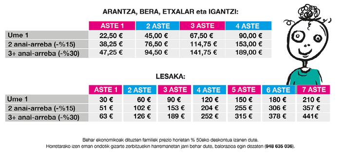 Prezioak aldatu eginen dira leku, aste kopuru eta matrikulatutako senideen arabera. Hona hemen prezioen taula: