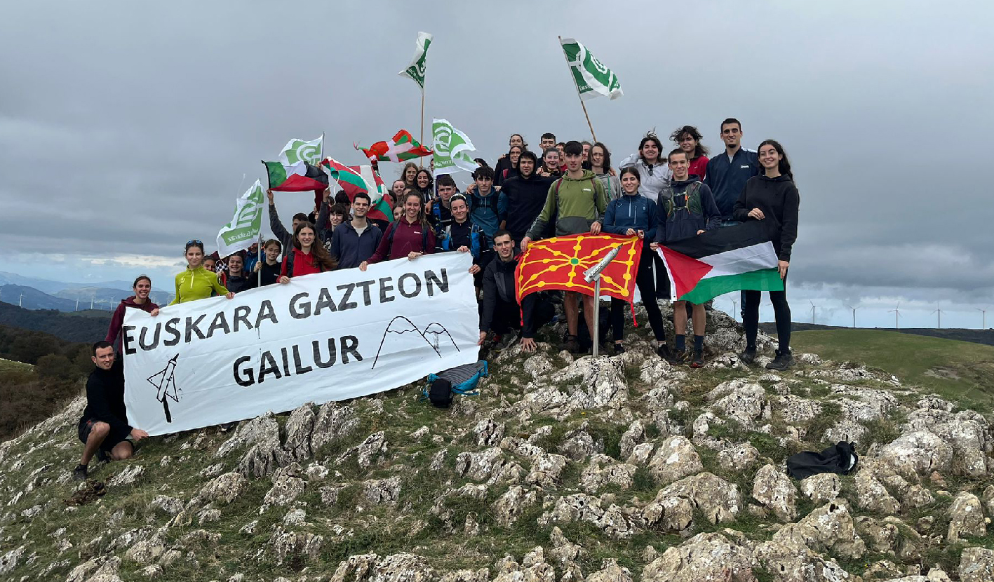 Hiru tokietako gazteak eguerdian elkartu ziren gailurrean. Bertan, norberak bere hamaiketakoa atera eta bista ederrez gozatzeko aukera izan zuten. “Euskara Gazteon Gailur” lemapean argazki bat atera zuten
