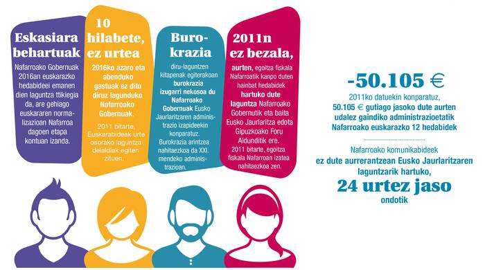 Batek baino gehiagok pentsatuko zuen Nafarroako euskarazko hedabideen egoerak hobera eginen zuela garai berriekin. Bada, ez da hala izan. Salbuespenak salbuespen, diru-laguntzei dagokionez, 2016a izanen da inoizko urterik txarrena. Ondoko orrialdean dagoen taulan ageri da hedabide bakoitzak Nafarroako Gobernutik (NG) eta Eusko Jaurlaritzatik (EJ) hartu dituen laguntzen bilakaera.
