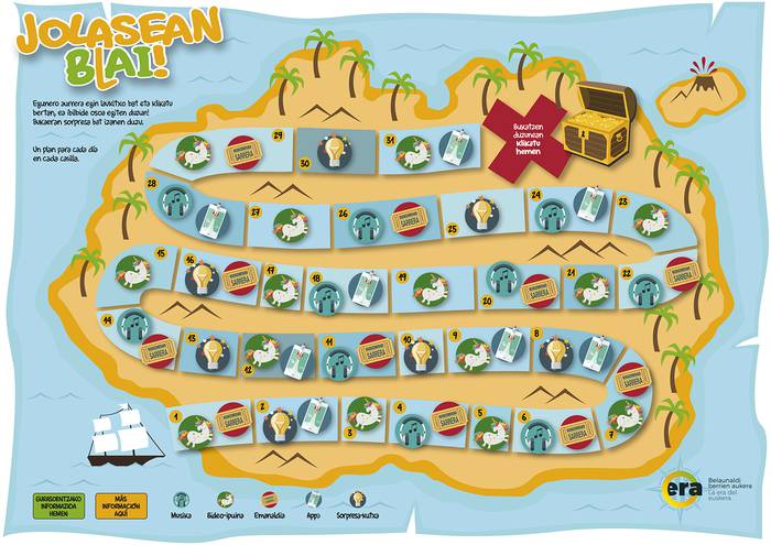 Ildo horretan, ERA.EUS gurasoen eskura jartzen du online dagoen material ugaria. Horretarako proposamenak bildu eta sailkatu dira, familiendako txukun, eroso eta erabilgarri aurkezturik. Helburu horretan urrats berri bat eginez, JOLASEAN BLAI mahai-joko birtuala argitaratu berri da. Honakoa onlineko kultur proposamenen hautaketa bat da, oporretarako dinamika bat proposatzen duena: Altxorraren uhartean barrena ibilbide bat egitea. Haurrak bakarrik zein gurasoekin batera aritu daitezke.